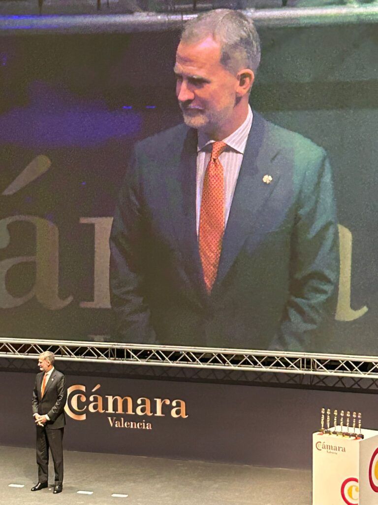 En la Noche de la Economía Valenciana, Vicente Ebri, Prior y Cónsul Mayor del Consulado de la Lonja de Valencia, acompañado por Francisco Senón, Viceprior 2º, José Ignacio Belenguer, Síndico, Antonio Llorens, Cónsul 3º, y Ana Ebri, Consiliaria 4ª, acompañaron a Cámara Valencia en una noche especial para los empresarios valencianos y la economía valenciana, donde se contó con la presencia de S.M. El Rey.