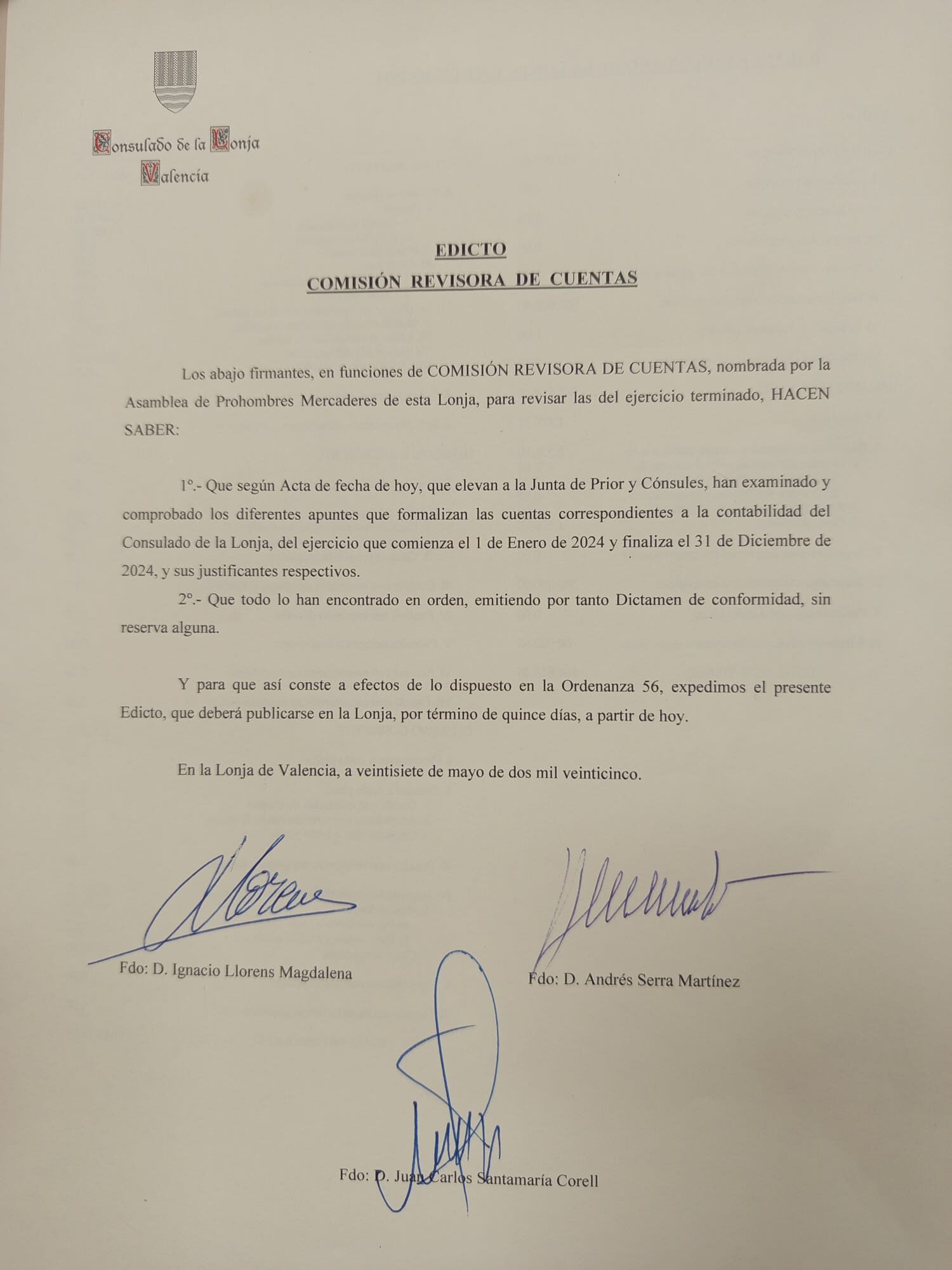 Edicto de la Comisión Revisora de Cuentas sobre las cuentas del ejercicio 2024